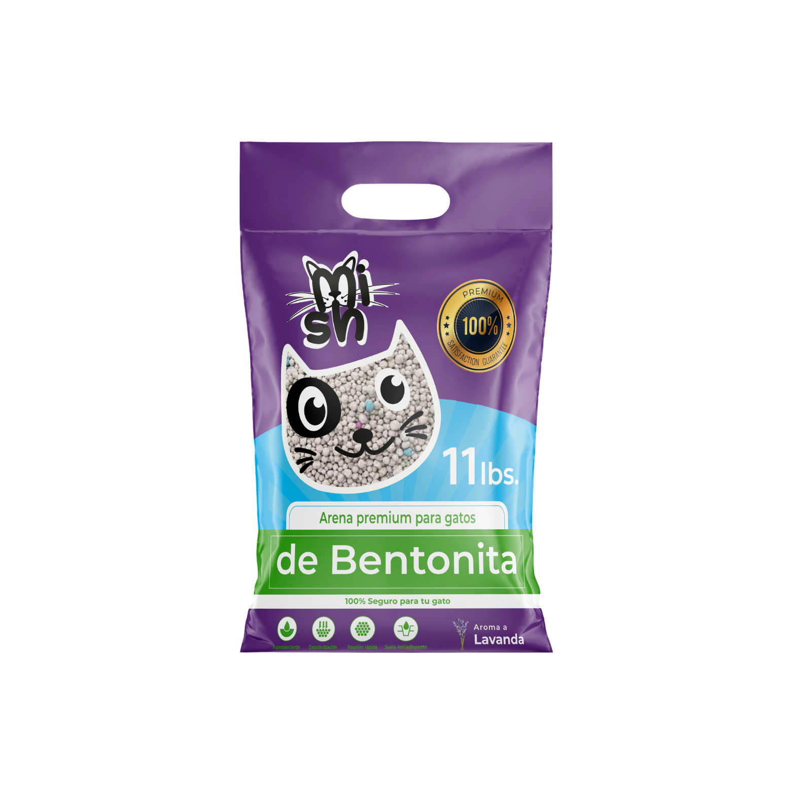 La composición de la arena Mish Lavanda prioriza la seguridad de los gatos. Está hecha de materiales naturales que son seguros para la salud de tu mascota. Este aspecto es crucial, ya que muchos dueños de gatos buscan productos que no solo sean eficaces, sino también no tóxicos. De igual manera, su textura suave y fina proporciona una experiencia cómoda para las patas sensibles de los gatos, fomentando una buena aceptación del producto.