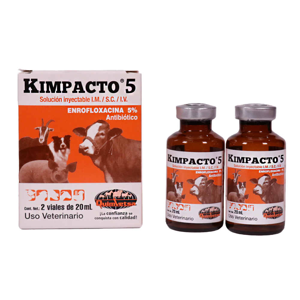 Kimpacto 5 Enrofloxacina 5% es una solución inyectable de amplio espectro, esencial para el tratamiento eficaz de infecciones bacterianas en su ganado, promoviendo una rápida recuperación y el bienestar general de sus animales. Su fórmula con enrofloxacina al 5% asegura una potente acción contra diversas enfermedades, contribuyendo a la salud y productividad de su hato. Consulte a su veterinario para un uso adecuado y maximizar los beneficios de este medicamento.